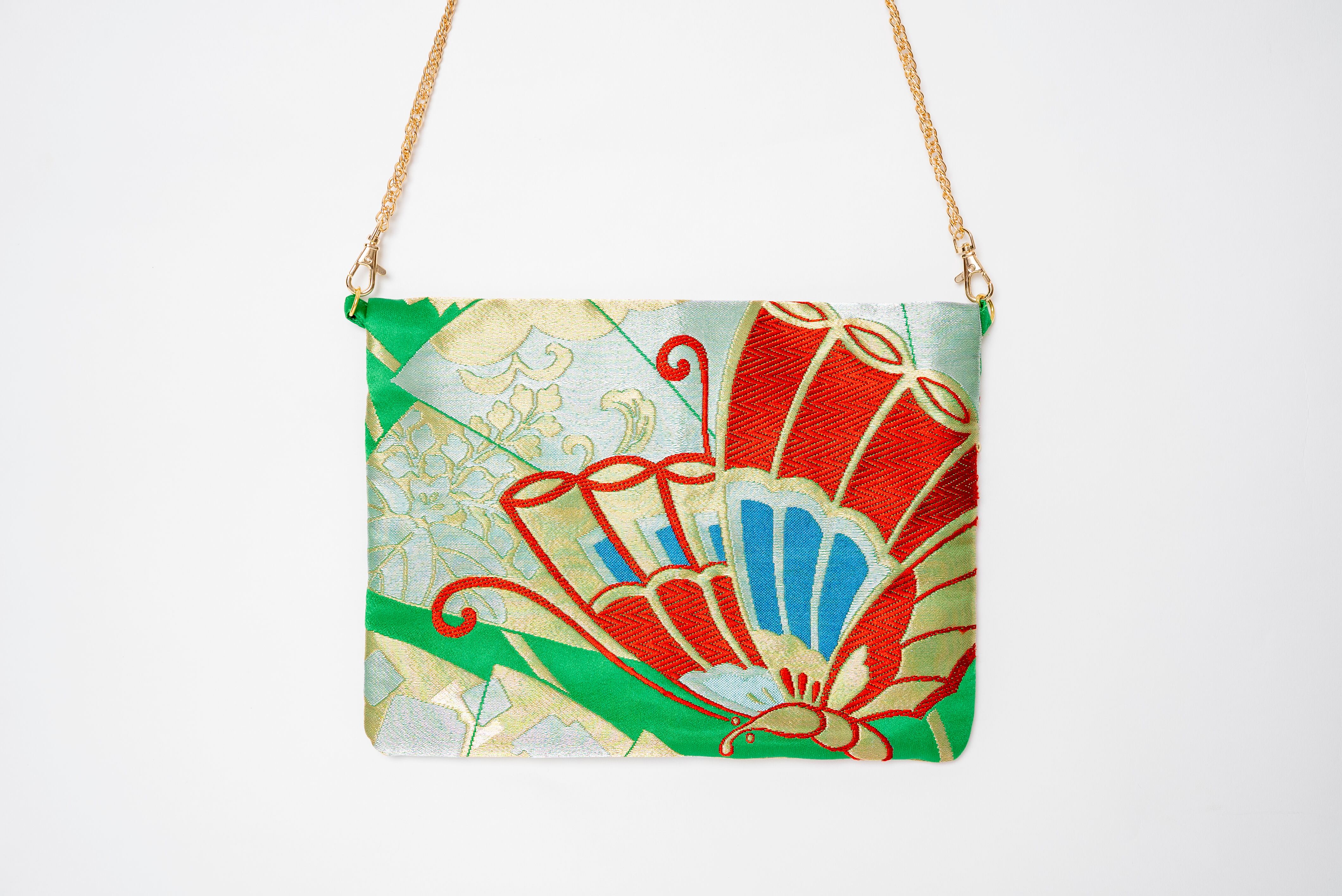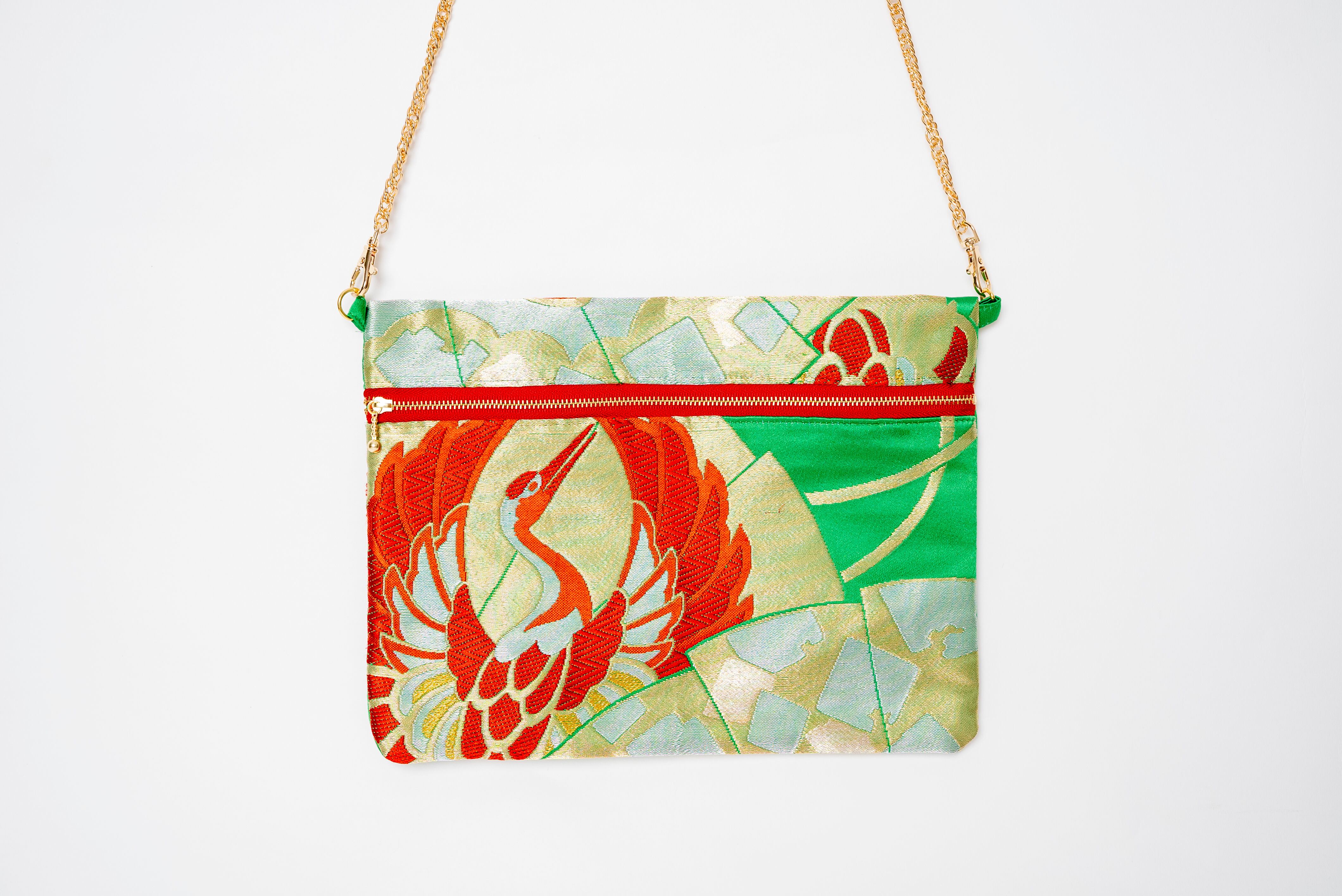 着物帯の生地を使ったリメイクバッグ。一つ一つ柄が違うのが魅力。どれも一点もの。繊細な柄物や鮮やかな色使いが、周りと差をつけるおしゃれ度を引き立てます。